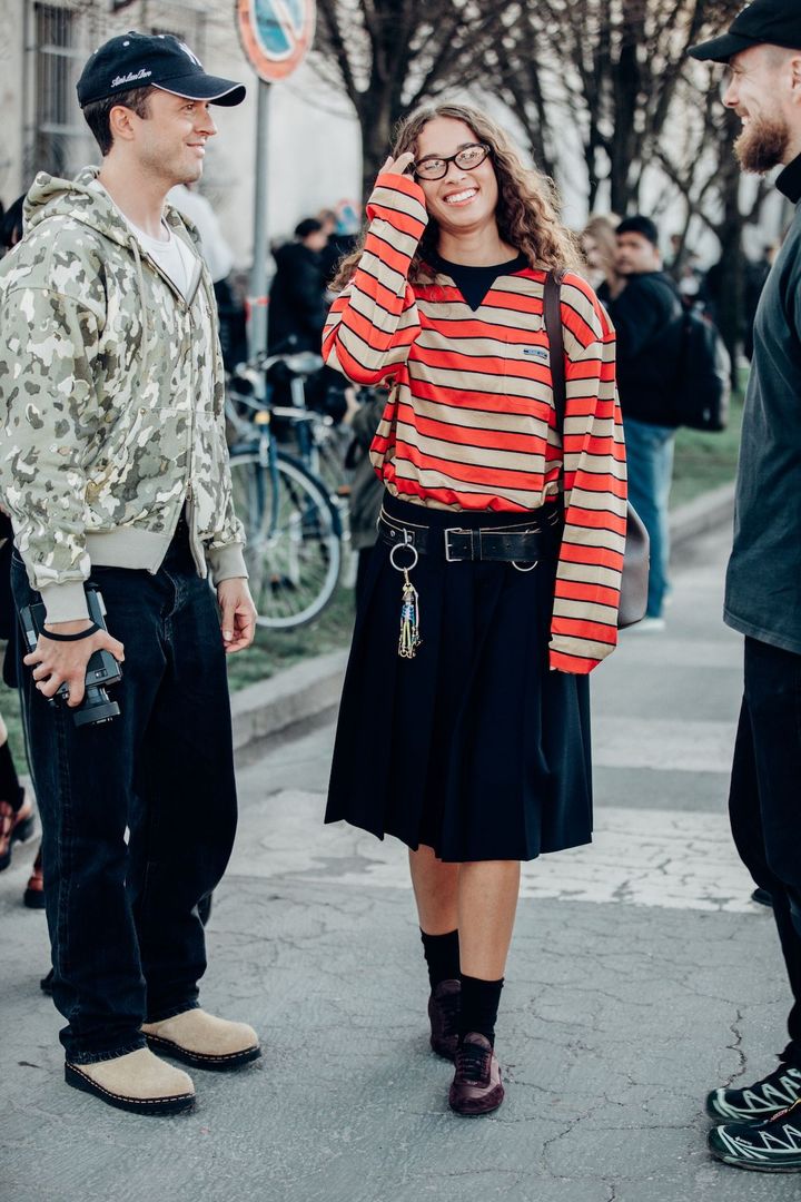 ミラノ・コレクションでキャッチしたファッショニスタは、ネイビーのプリーツスカートをベースに、太めのベルトとチャームで個性をプラス。制服を思わせるプレッピースタイルを今季らしくアップデートしつつ、ポップなカラーリングのロンTを合わせることで、アクティブなムードを演出。