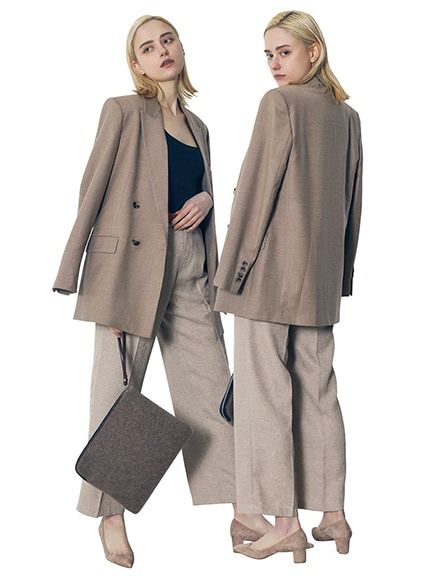 あたたかみのあるウールとドライな質感のリネン。どちらもニュートラルな色だから、季節感にとらわれない新感覚のセットアップ風に。黒タンクをさし色にすれば、淡いトーンもぼやける心配なし。