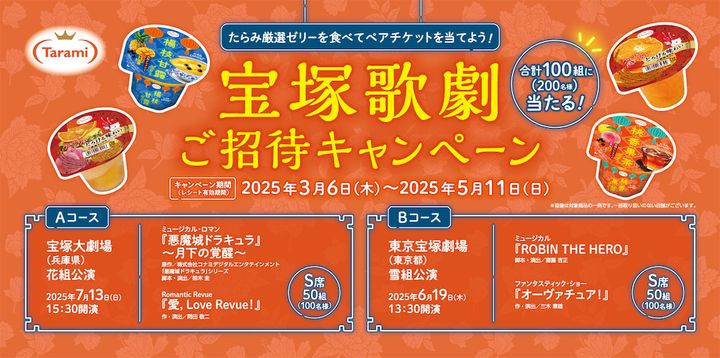 「たらみ Dessert」の発売を記念して、宝塚歌劇の観賞ペアチケットが当たるキャンペーンや、「たらみ Dessert」のモニターを募集するキャンペーンも開催されます。