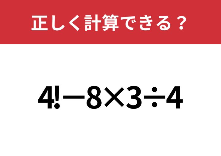 「!」の計算ってどうやるんだっけ?「4!−8×3÷4」正しく計算できる?