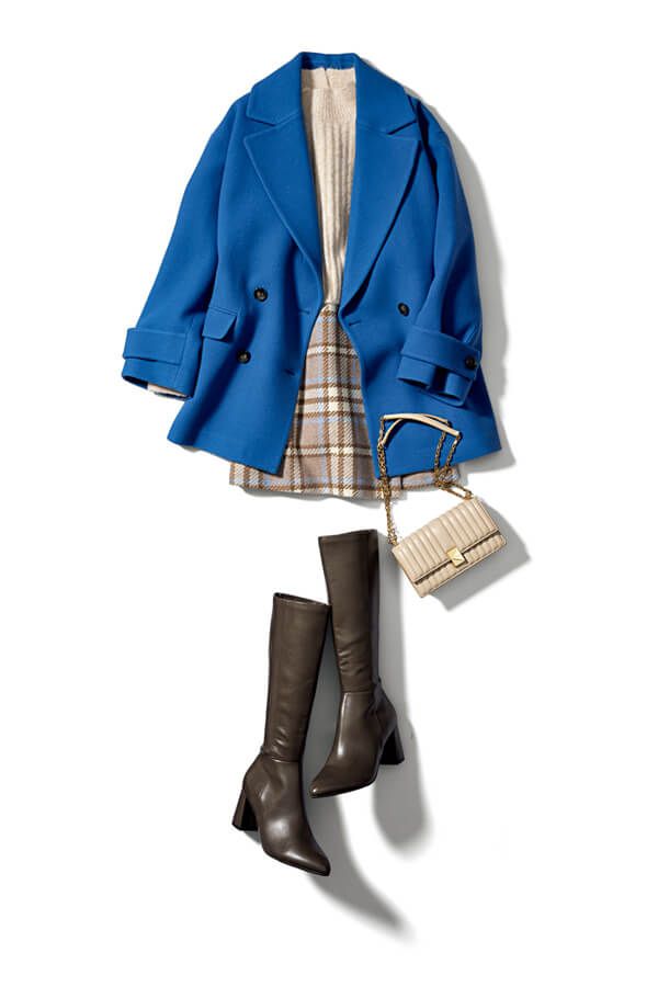 ハイソなロイヤルブルーのコートと合わせれば、ガーリーなチェックミニがぐっとこなれた印象に。