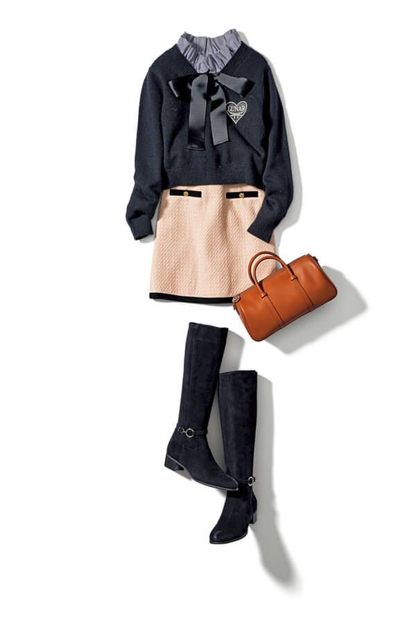 ボウタイリボン+ツイードミニでパリっぽフェミニンに