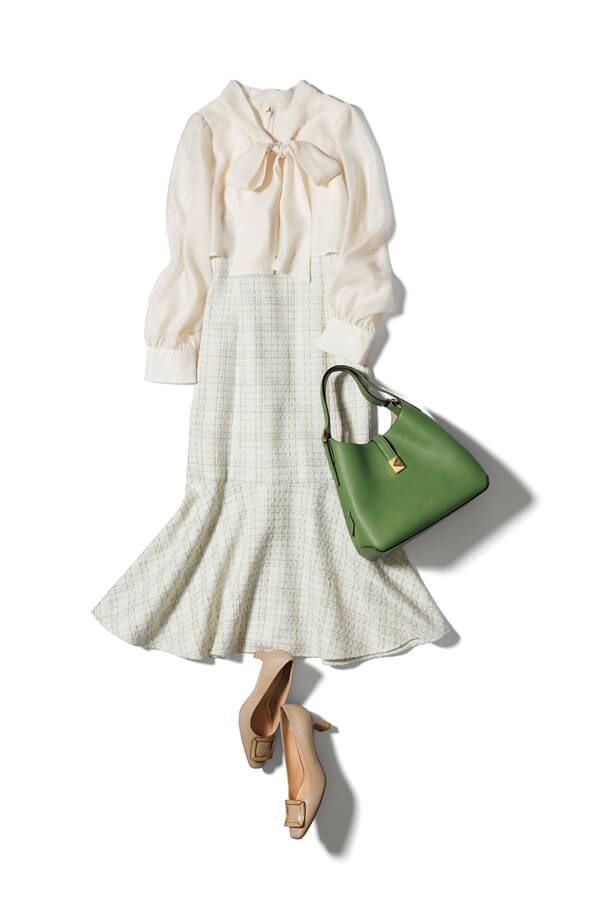 ボウタイブラウスとツイードスカートをドッキングしたワンピースは、1枚でコーディネートが完成するので忙しい朝の強い味方。×グリーンバッグで上品に。