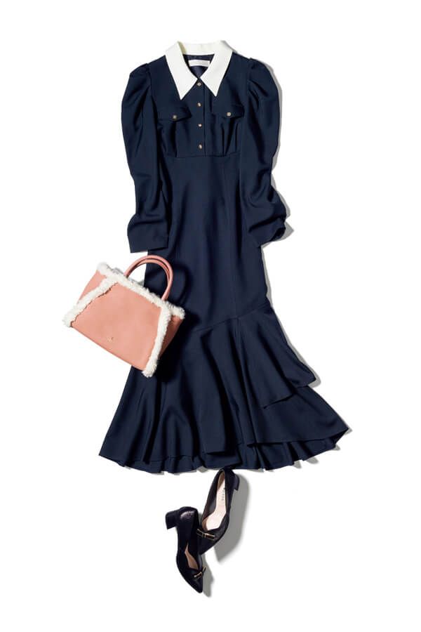 裾にほどこしたアシンメトリーの切り替えフリルで、フォーマルさの中におしゃれ要素も忍ばせて。手元に添えたファー付きのピンクバッグも冬らしい華やかなアクセント。