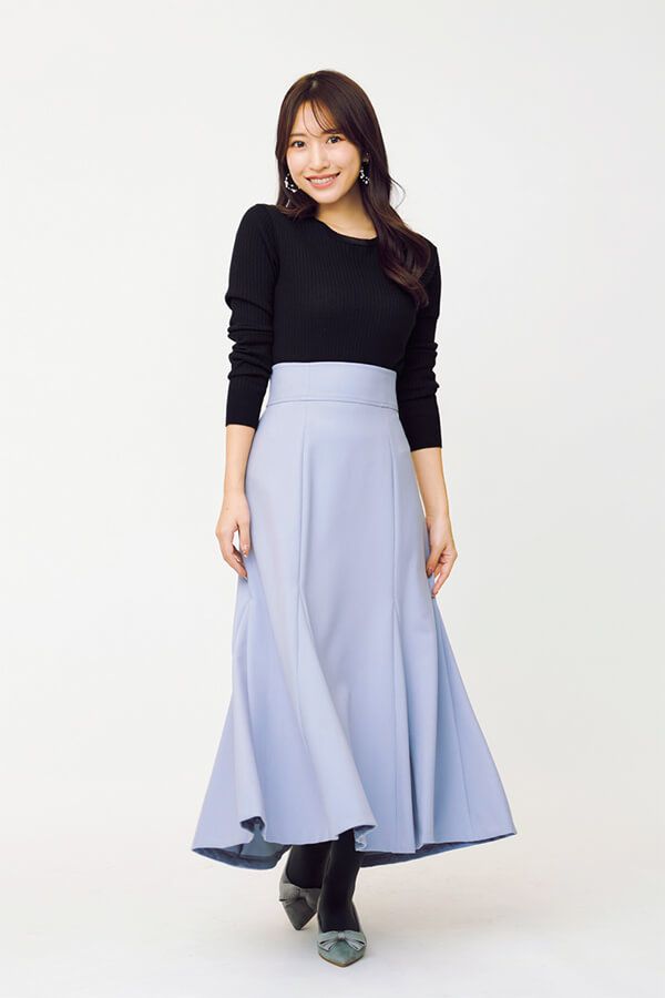 冬のトレンド服を着用したときの印象をひたすら見える化!低身長156cmの伊藤渚さんと、高身長168cmの門脇伶奈さんが同じアイテムを着比べ。スタイルアップ必至のマーメイドスカートを比較!
