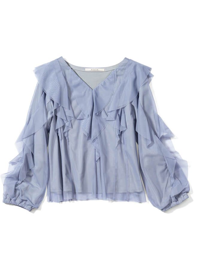 チュールを贅沢にトッピングしたカットソーも、くすみカラーなら大人っぽ見えが可能。アイシーブルーのチュールでクールビューティに。