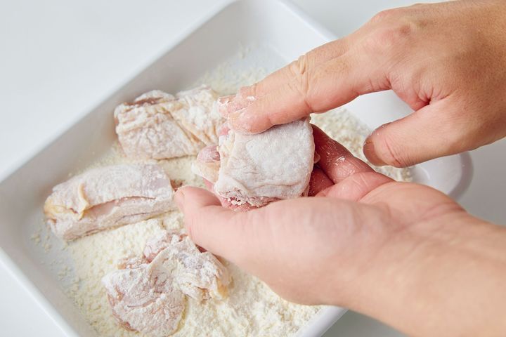 (1)ねぎは斜め薄切りにする。鶏肉は一口大に切り、塩、こしょう各少々をふって、小麦粉を薄くまぶす。〈A〉は混ぜる。