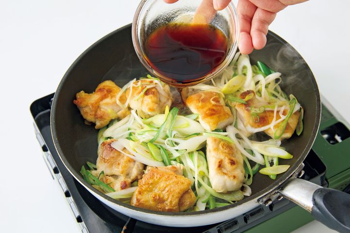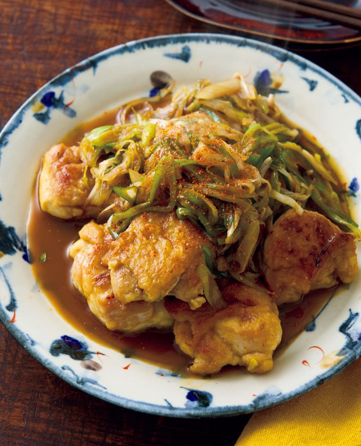 (2)フライパンにサラダ油小さじ2を中火で熱し、鶏肉を皮目を下にして入れる。2~3分焼き、焼き色がついたら返して、さらに2分ほど焼く。ねぎを加えてひと混ぜし、〈A〉を加えて1~2分炒め合わせる。器に盛り、一味唐辛子少々をふる。