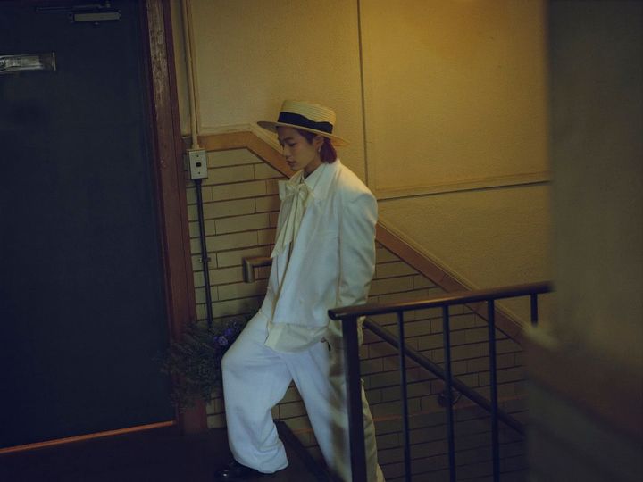 ジャケット ¥82,500、ボウタイシャツ ¥38,500(共にGALAABEND/3RD[i]VISION PR)、スウェットパンツ ¥24,970(irojikake)、ハット¥23,100(STETSON/STETSON JAPAN)、シューズ ¥14,300(HARUTA)、右耳:ハートイヤーカフ¥14,080、左手:ブレス ¥19,580、シルバーリング ¥14,080、ゴールドリング ¥15,180(全てKNOWHOW jewelry)、右手:小指リング ¥484,000(JUSTIN DAVIS/ジャック・オブ・オール・トレーズ プレスルーム)