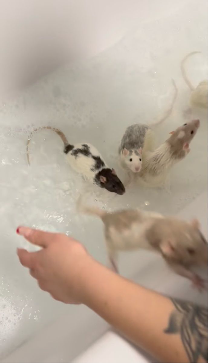 一方、飼い主さんはネズミたちにもう少しお風呂を楽しんでもらいたい様子。 「もう少しだけ浸かったら?」とばかりにネズミたちを湯船に戻しています。
