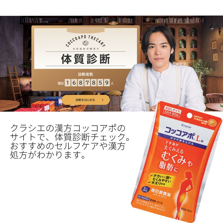 コッコアポのサイトの体質診断チェックで下半身がむくみやすいタイプと判明。防己黄耆湯の漢方薬で水分代謝を上げ、むくみや水太りを解消。コッコアポL錠[第2類医薬品]60錠¥1,100(クラシエ薬品お客様窓口)
