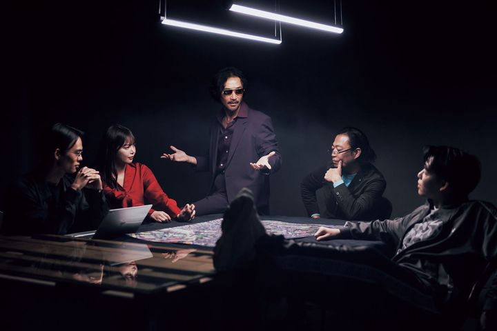 アジトで何かを企む地面師たち…。(左から)【交渉役】メガネ48,400(アイヴァン/アイヴァン 東京ギャラリー)【手配師】すべてスタイリスト私物【主犯格】サングラス¥95,700(ディータ/ディータ フラッグシップ 青山店)ネックレス¥44,000リング¥36,300(ともにバフ/バフ)【法律屋】ジャケット¥38,940 (アバハウス/アバハウス 池袋パルコ店)セーター¥20,900(デザインワークス/デザインワークス 銀座店)【情報屋】ジャージ¥16,500スウェット¥14,300(ともにトイマシーン/クエスト)セーター¥39,600(ムッシュ ニコル エクストラ/ニコル)ほかすべてスタイリスト私物