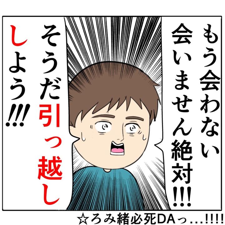 いよいよ後がなくなったろみ緒さん。「もう会わない!会いません絶対!!!そうだ。引っ越ししよう!!!」と引っ越しを提案します。