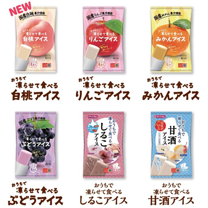 「おうちで凍らせて食べるアイス」シリーズは、新登場した「白桃アイス」の他にも、「りんごアイス」「みかんアイス」「ぶどうアイス」「甘酒アイス」「しるこアイス」と、全部で6種類があります。