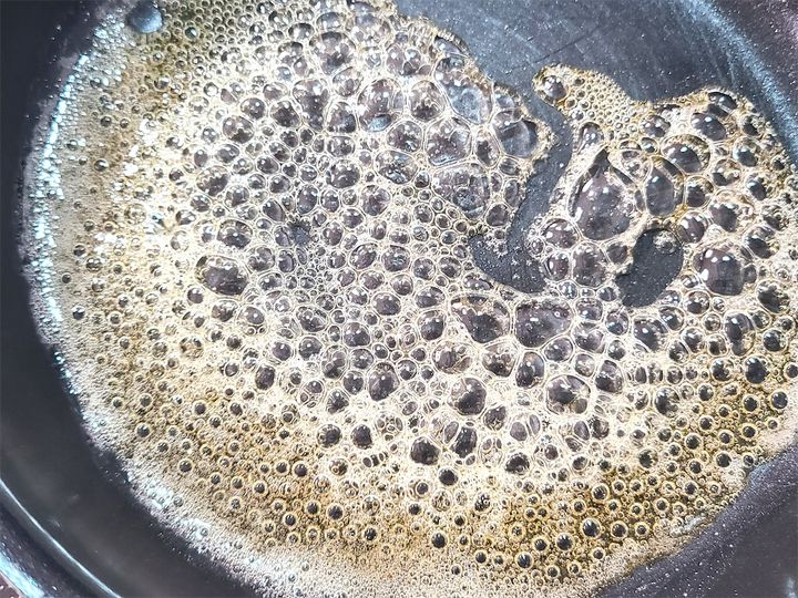 5. フライパンに蜂蜜を入れ弱火でとろみが出るまでじっくりと煮詰め、レンチンした4のさつまいもを入れてムラがないように手早く混ぜます。