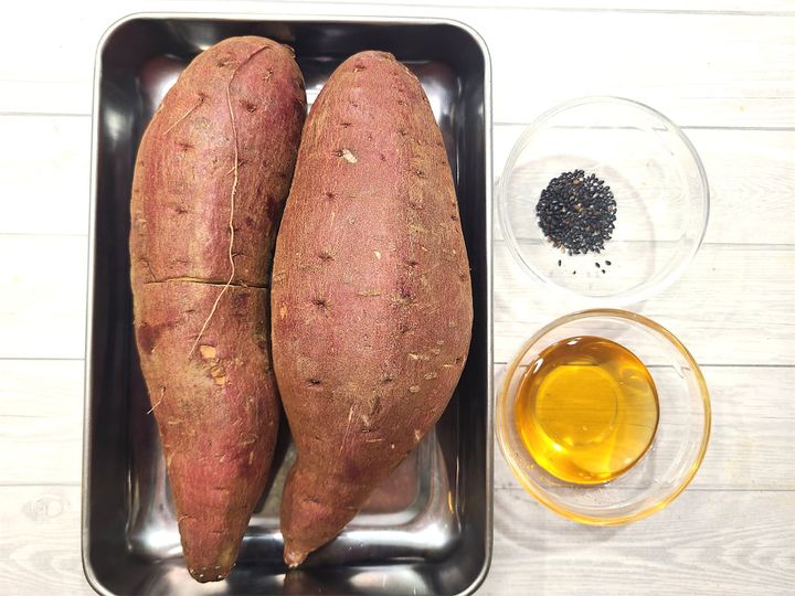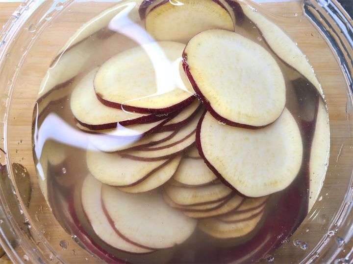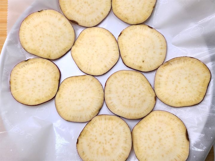 1. さつまいもは皮ごと使うので、しっかり洗いましょう。その後、5mmくらいの厚さにスライスします。熱の通りを統一するため、均等に切るのがポイントです。