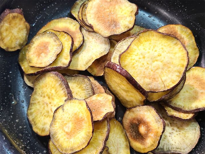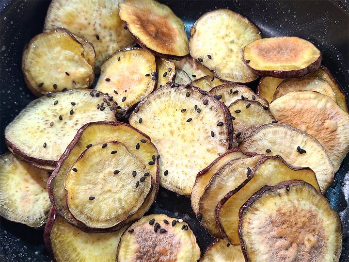 さつまいものスライスは、薄ければ薄いほど時短調理につながる気がしました。わたしは5mmを目指したのですが、それでも少し厚かったようで追加で何度か加熱しました。もっと薄くスライスすれば一度の加熱でカリカリに仕上がっていたと思います!スライサーを使うのもアリかもしれません。