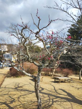 こちらが北口付近の梅の木。今年は寒波の影響で梅の開花は遅れているようですね。開花はしていましたがまだつぼみが多い印象です。その分花が長く楽しめるといいですね!