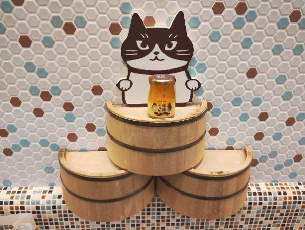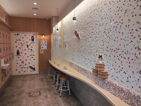 「温泉」をモチーフにされた店内。壁面のタイルに猫や桶がデザインされていて、SNS用の映える写真も撮ることができます。