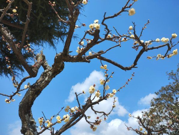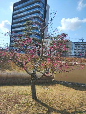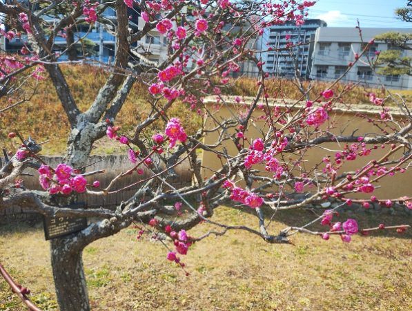 武家屋敷の方の梅の花。日当たりがよさそうな枝は開花が進んでいました!つぼみもまだたくさんありましたので、まだまだ花を楽しめそうです。遊具のない湯築城跡のエリアはまだ息子を連れてきたことがないので、また一緒に遊びに来ようと思います。