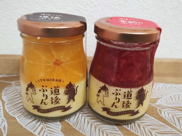 道後ぷりんは、とろとろぷりんにみかんがどーんと丸ごとひとつ!半分にカットされて入っています。みかんのまわりはゼリーになっています。ぷりんはバニラビーンズがきいたトロトロ系です。みかんとぷりんを一緒に食べるのがおすすめです!