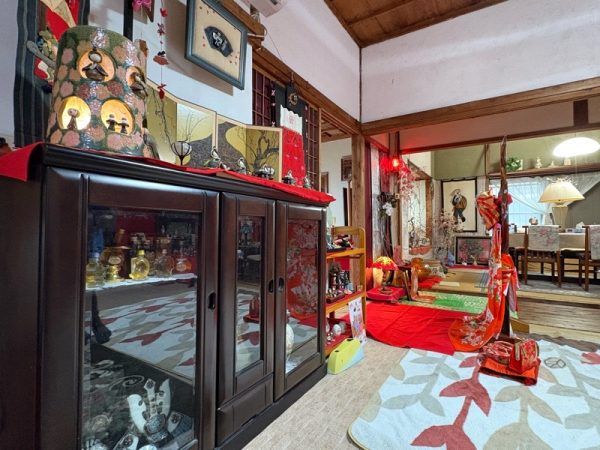 玄関には、レトロなミシンや壺などと共にお雛様が展示されています。
