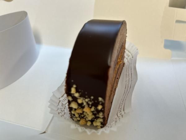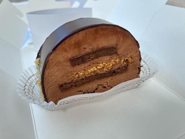表面のチョコレート部分は、フォークがスッと入る硬さ。中のナッツ部分がアクセントになって、ずっとフォークが止まらない美味しさでした!