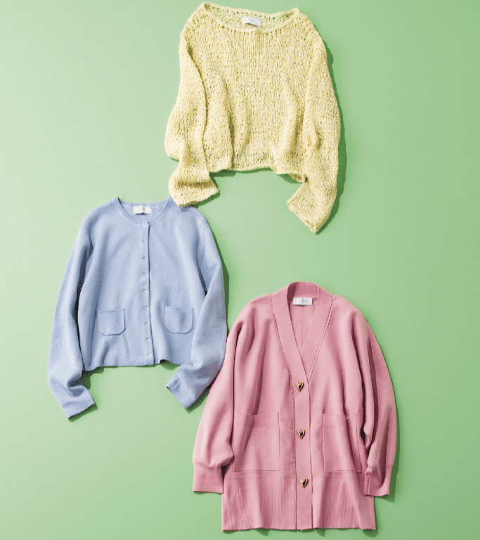 Aコーデも顔色もフレッシュに見せるエッグイエロー。ローゲージの編み地で、レイヤードが楽しめる。ショートニット¥10,450、B顔色をクリアに見せるパステルブルー。シーズン長く着られるコットン混のカーディガン。程よい着丈でパンツともスカートとも合わせやすい。¥11,000(ともにスローブ イエナ)C血色感が生まれる春らしいピンク。ハートのボタンにときめきを感じる1枚。¥14,960(アダム エ ロぺ)