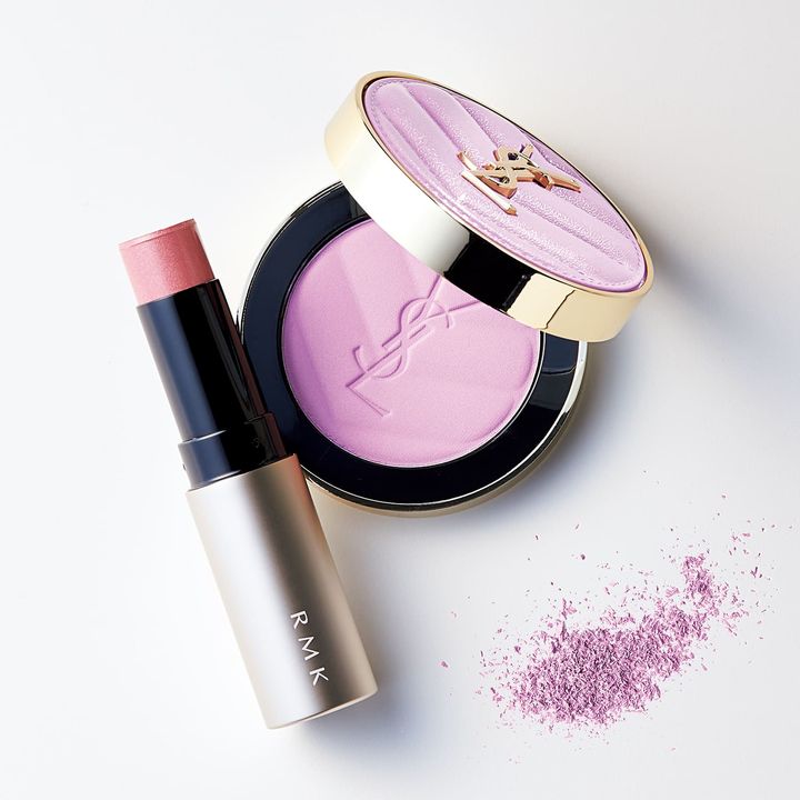 左:繊細な偏光パールが透明感を出すライラック。RMK ラディアントカラースティック 04 ¥3,630(RMK Division)右:頰にクリアな血色をもたらすサテン質感。YSL メイクミーブラッシュ パウダー 42 ¥8,360(イヴ・サンローラン・ボーテ)