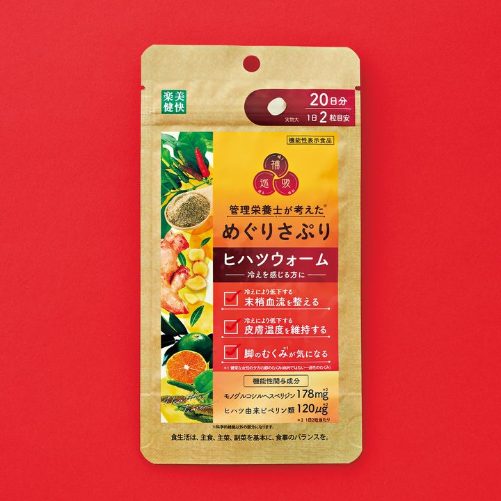 1.「補う」だけでなく「吸収」「巡る」の3ステップで低下した末端血流を正常に整え皮膚温度を維持するとともに、脚のむくみまで軽減する効果が! 20日分 ¥1,717(キリン堂)