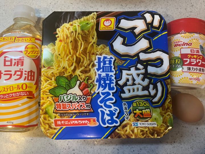 わが家でストックがある率高いもの、それがカップ焼きそばです。で、今日は面白いアレンジレシピを見つけたので試してみようと思います。それがYouTubeチャンネル「まるみキッチン」で紹介していた【塩焼きそばでごつ盛りお好み焼き風】。どうやら塩味の焼きそばに小麦粉、そして卵をプラスして、お好み焼きの生地風に仕立てるようです。カップ焼きそば自体に味がついているので、何もかけずとも十分おいしく食べられるのだとか。さっそく作ってみましょう♪