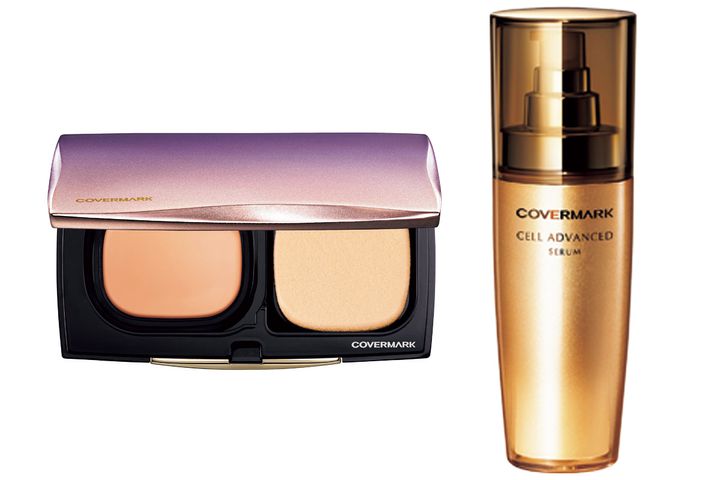 (左)シミ、くすみを瞬時にカバーするクリームファンデーション。フローレス フィット 全10色 SPF35・PA+++ ¥7,700(セット価格)(右)濃密なハリ肌へ。セルアドバンスト セラム WS 40g ¥14,850(ともにカバーマーク)