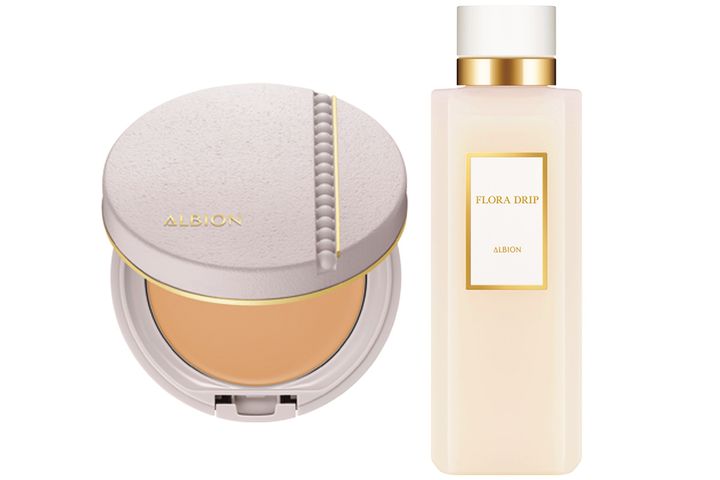(左)アルビオン スタジオ タフウェア ソリッド SPF50+/PA++++ 全6色 ¥6,600〈セット価格、2/18発売〉(右)肌のコンディションを高める。フローラドリップ s 160ml ¥14,300(1/18発売)(ともにアルビオン)
