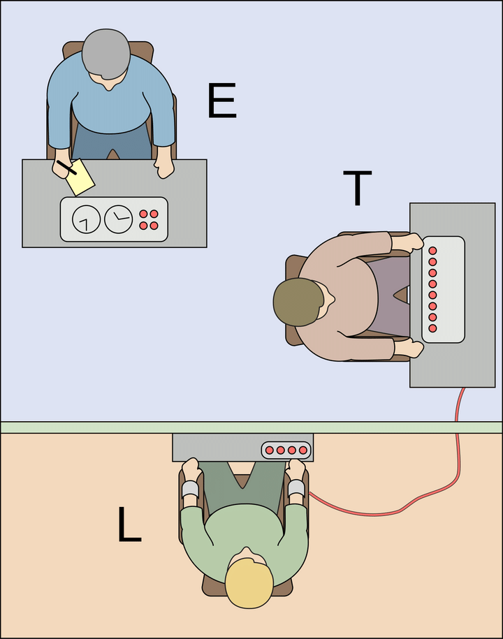 実験の略図。Lが生徒役、Tが被験者、Eが命令する実験者/Credit:Wikimedia Commons