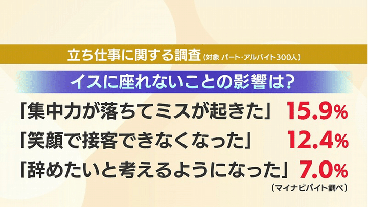 イスに座れないことの影響を聞いたところ「集中力が落ちてミスが起きた」「笑顔で接客できなくなった」という回答のほか、「辞めたいと考えるようになった」という声もありました。## だいぶ楽になった…