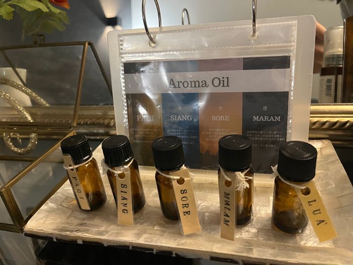 空間に癒され、施術前のお茶をいただきながら使うオイルを選びます。