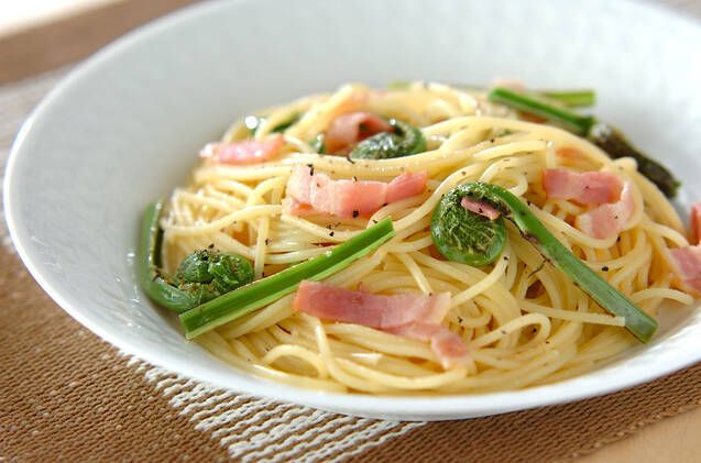 くせがなく食べやすいコゴミをイタリアンのペペロンチーノに加える一皿。コゴミのヌメリがパスタに絡んでおいしい! コゴミは和風だけでなく洋風な味付けにもしっかりマッチします。