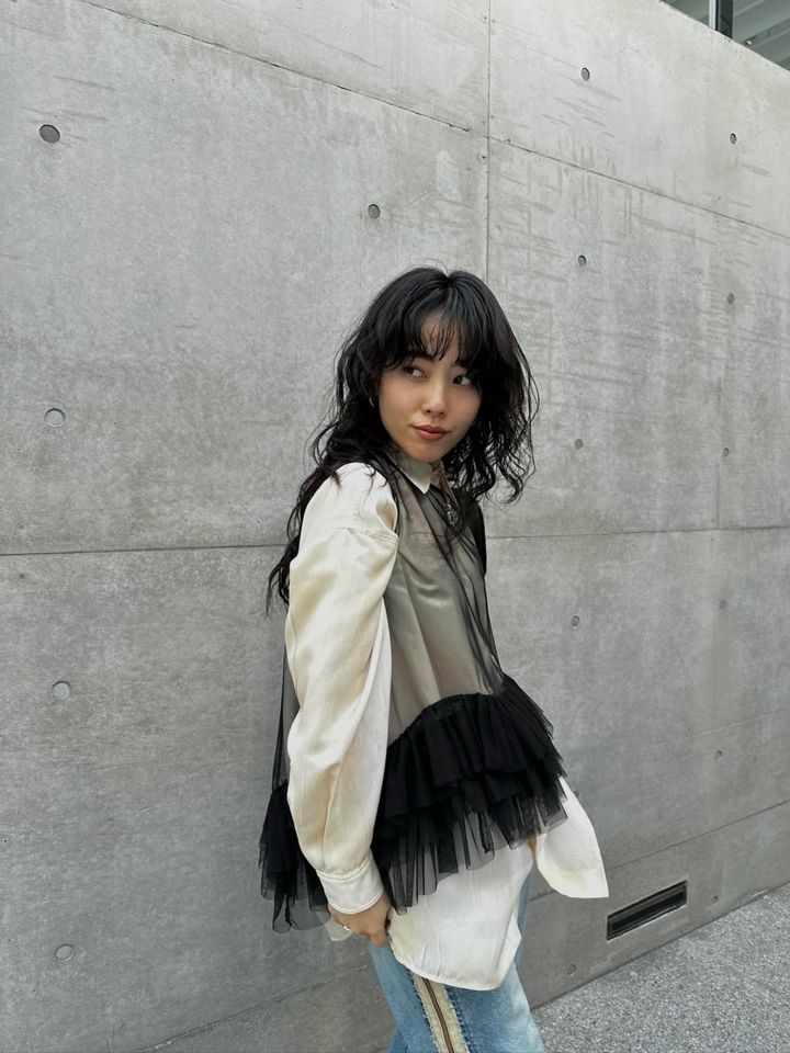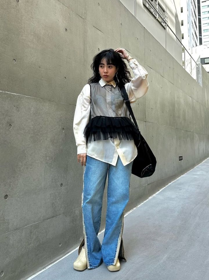 「今季まず購入したのはAmeriの新作、ブラックチュールのトップスです。軽やかで立体感もあり、カラーコーディネートを引き締めてくれるので、これから重宝しそうです。季節の変わり目はデニムがはきたくなるので、今日はベージュのラインが入ったデニムを合わせました。ラインの色みと合わせて、シャツやミュールもクリームカラーに統一しています。チュールのトップスを合わせることで、こなれ感のあるスタイリングを意識しました」