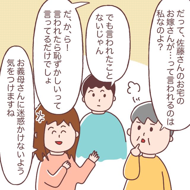 「だって、佐藤さんのお宅のお嫁さんが・・って言われるのは私なのよ?」とぷんすかする義母に夫のゆうたさんは「でも言われたことないじゃん」と言い返します。