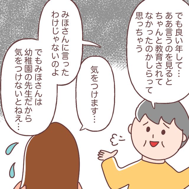 すると義母は「みほさんに言ったわけじゃないのよ。でもみほさんは幼稚園の先生だから気をつけないとねえ・・・」とチクリと嫌味を言いました。