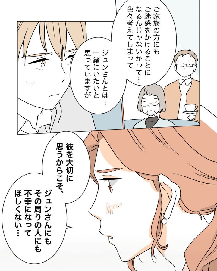 「ご家族の方にもご迷惑をかけることになるんじゃないかって・・色々考えてしまって、ジュンさんとは・・一緒にいたいと思っていますが、彼を大切に思うからこそ、ジュンさんにも、その周りの人にも不幸になって欲しくない・・」