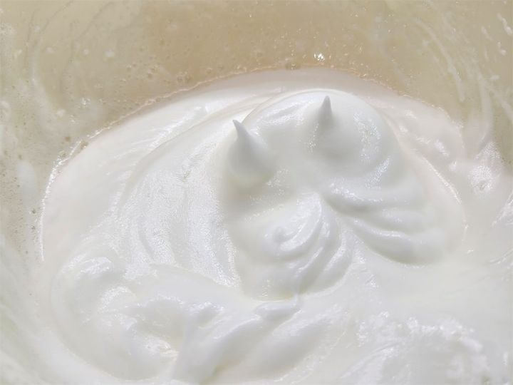 5. 別のボウルに卵白を入れミキサーで泡立て、砂糖を2回に分けて加えます。角がたつくらいになったらOKです。