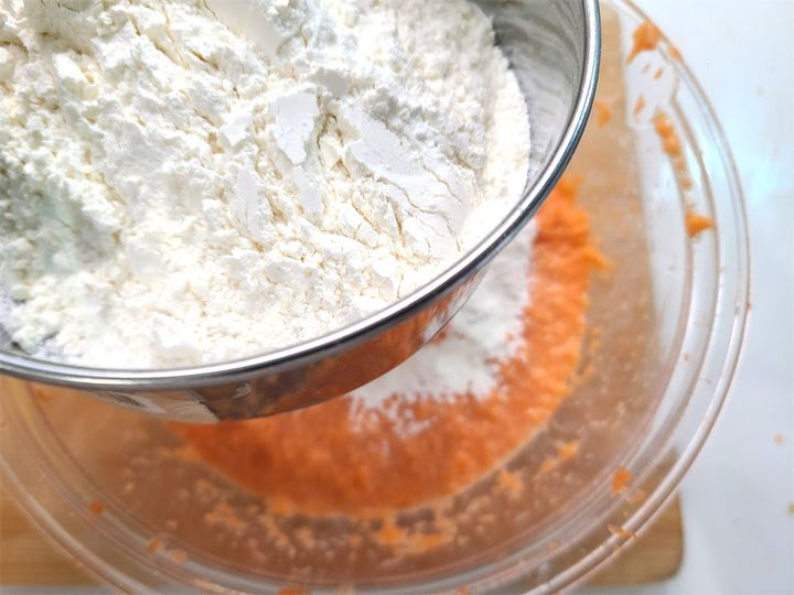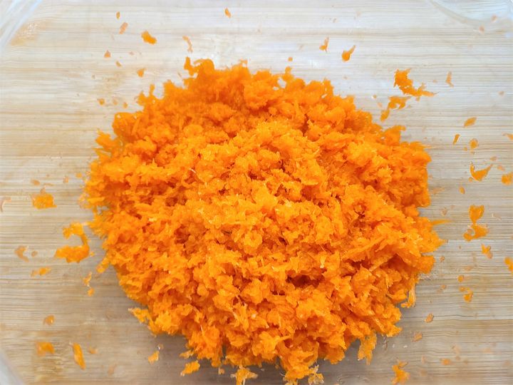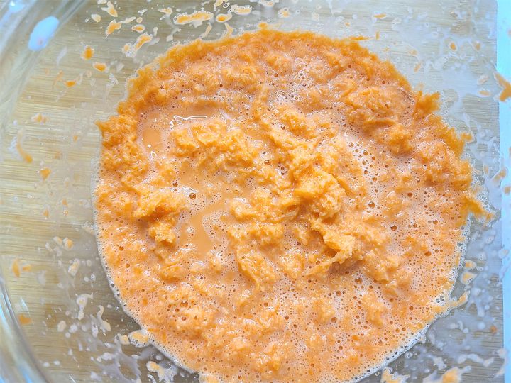 3. 大きめのボウルにすりおろしたにんじんを入れ、牛乳、グラニュー糖、卵黄を入れよく混ぜ合わせます。卵白はあとで使うので冷蔵庫で冷やしておきましょう。