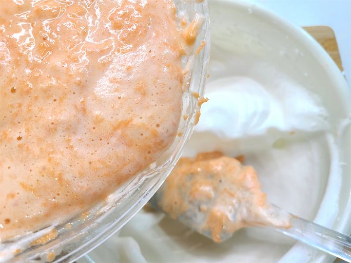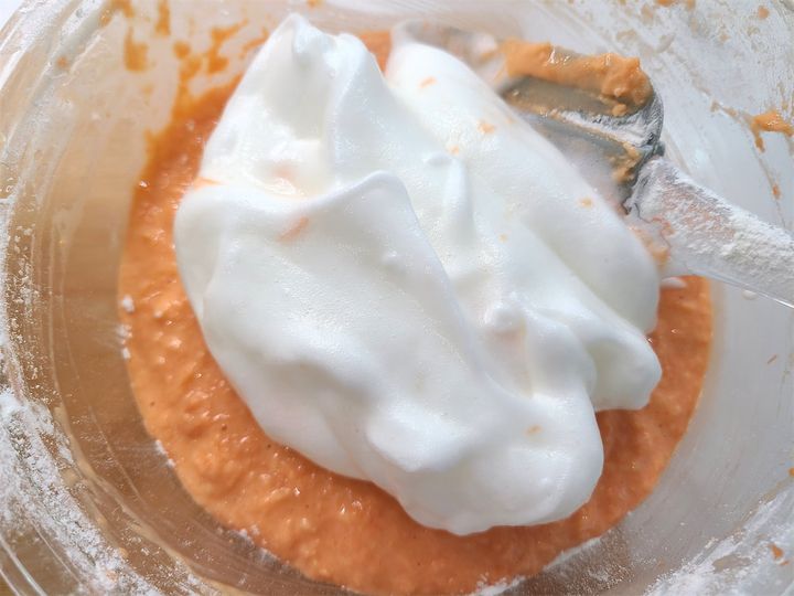 7. 残りのメレンゲが入っているボウルに6を全て入れて、メレンゲを潰さないように底から切るようにして混ぜます。