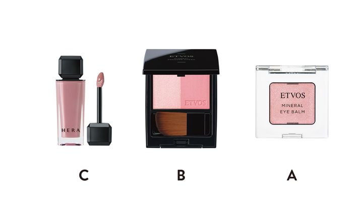 しなやかさを感じる淡いトレンドメイク。はっきりした顔立ちを生かすため色みは控えめにしつつも、目元のツヤやリップの潤いの質感で華やかさを演出。Aの淡いピンクのアイシャドウは、指にとって上下まぶたの中央に。バームタイプで光が出るのでさらりとでOK。Bのチークはブラシで2色ミックスして、頬の中央から横長に入れる。Cのグロスは唇の形通りに、全体に軽くのせる。