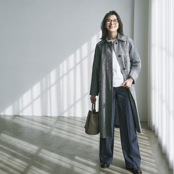 最高級の超長綿であるスーピマコットン100%のケーブル編みニットは、グレンチェック柄のコートとプレスが入ったデニムのトラウザーパンツでキリリと。このハンサム感で、女性らしさを際立たせて。コート¥75,900、ニット¥22,000、パンツ¥36,300、バッグ¥61,600、靴¥97,900/すべてブルックス ブラザーズ(ブルックス ブラザーズ ジャパン)、 メガネ¥42,900/アイヴァン(アイヴァン 東京ギャラリー)