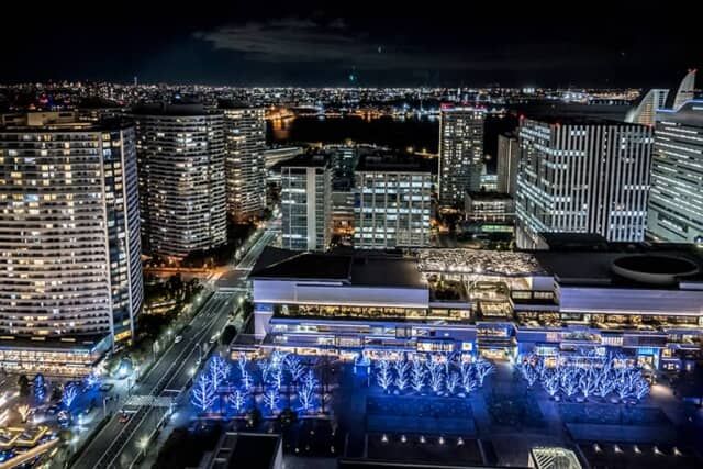 みなとみらいの街の灯りやベイエリア、遠くには東京のビル群や点灯する東京スカイツリーが見えました。