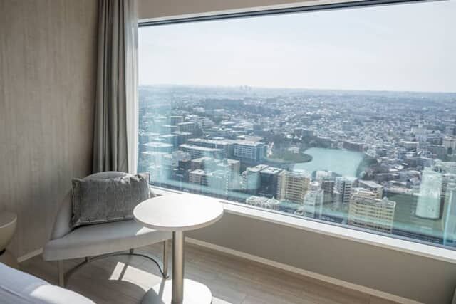 特別なホテルステイを楽しむのなら、おすすめは「エグゼクティブコーナーキング」です。46.1平米の角部屋は2方向の壁全面がガラス張りになっていて、高層階からのパノラマビューは圧巻です。