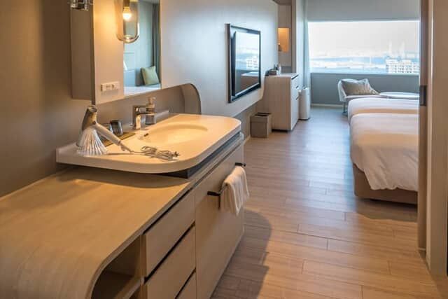 客室は21階から27階までの全364室。電子レンジや洗濯機付きの部屋もあるなど、滞在スタイルや人数に合わせた13タイプをそろえるとともに、ハーバービュー側とマウンテンビュー側などがあります。全ての客室とその備品はクルーズ船の客室をイメージしていて、床は一般的なカーペットではなく、甲板を思わせるフローリングになっています。