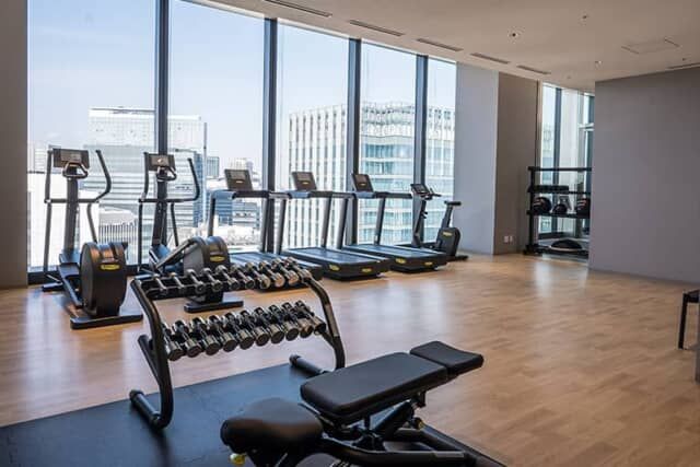 高層階から眺める非日常の景色とともにテクノジム社のマシンでトレーニングができます。
